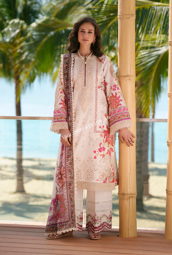 AIRA features a printed lawn shirt beautifully adorned with intricate Chikankari embroidery on the front, highlighted by an elegant embroidered neckline. Embroidered sleeve motifs and trouser borders add delicate sophistication, while printed lawn sleeves and back maintain a cohesive charm. Paired with dyed cotton trousers and a soft chiffon printed dupatta, this ensemble exudes timeless grace and refined elegance.